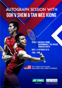 Malaysia’s No. 1 men’s doubles badminton team Goh V Shem and Tan Wee Kiong are coming to Bangsar South! Don’t miss this opportunity to meet and greet our famed shuttlers, happening this Friday (4 Oct) at MaxValu Prime supermarket in The Sphere!