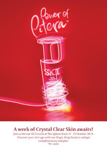 A week of Crystal Clear Skin awaits! Join us for our SK-II event at The Sphere from 21st – 25th Oct 2019, 8am – 6pm. Discover your skin age with our Magic Ring Analysis and get complimentary samples. T&Cs apply.